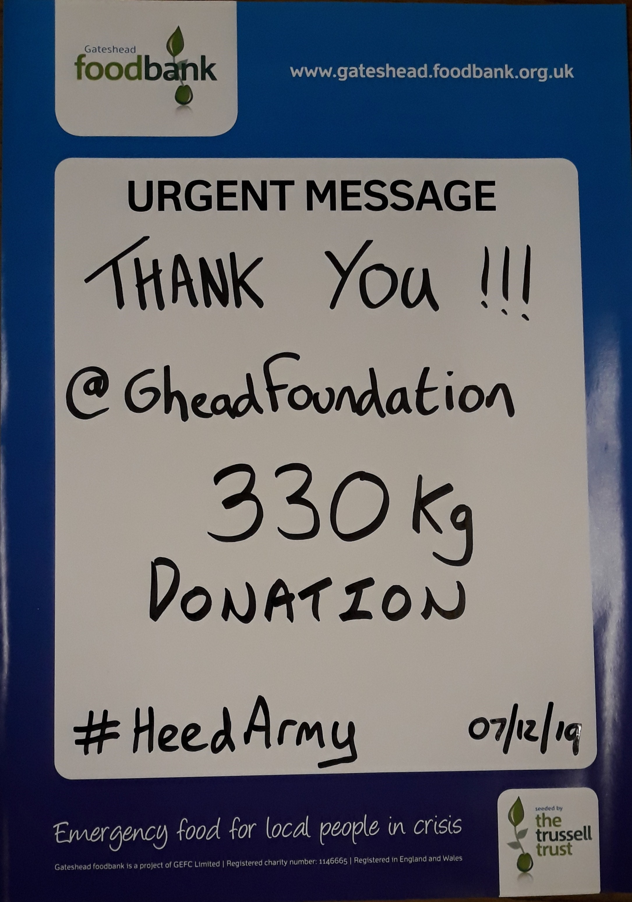 A collection for the Gateshead Foodbank was held at Gateshead International Stadium. Thanks to the amazing generosity of Heed, fans 330Kg of food was donated. Thank you so much for your support!